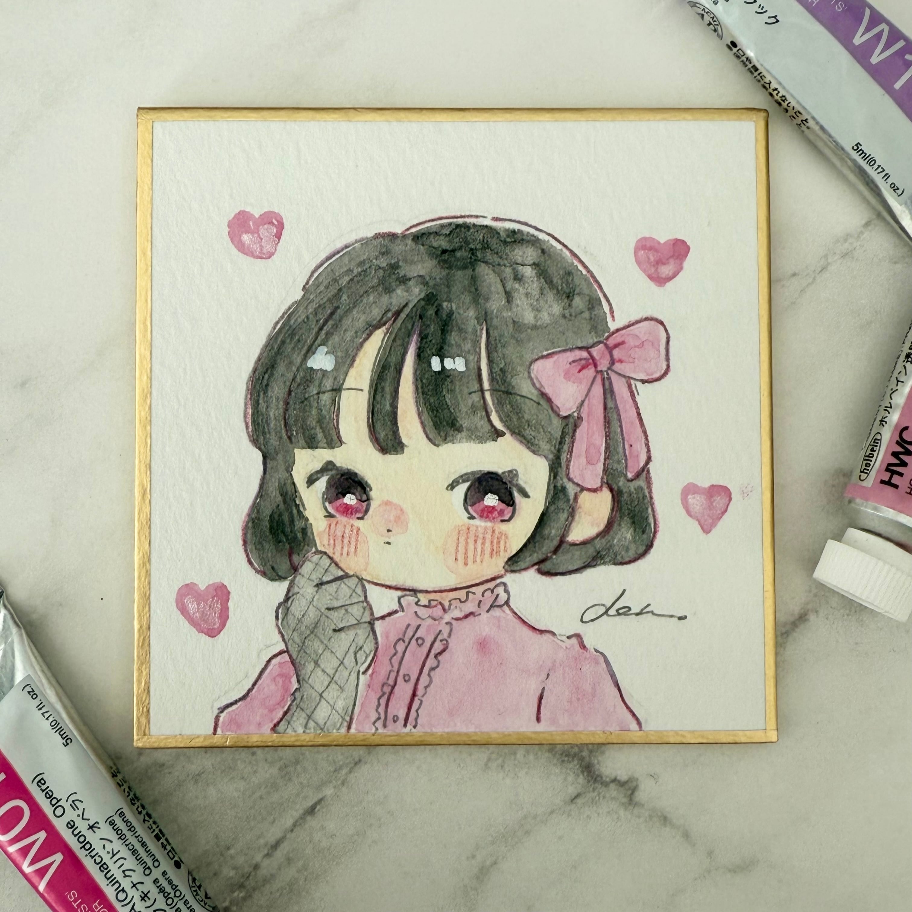 飾りやすいミニ原画色紙に透明水彩で描きました
